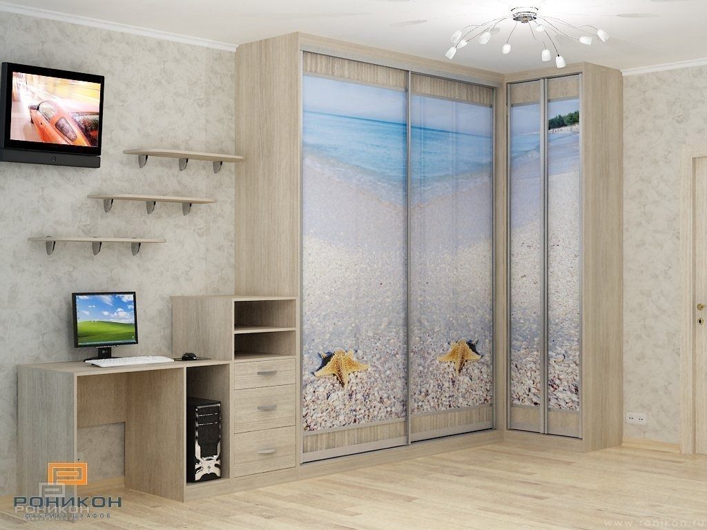 Шкаф-купе угловой формы под потолок с интегрированным компьютерным столом и тумбой с ящиками с фотопечатью на фасадах. В дизайне мебели преобладает Egger флитвуд белый, использованы безопасные плитные материалы класса Е1 ЛДСП 16 мм в кромке 2 мм по видимой части, применена фурнитура Hettich, нижнеопорная система купе.
