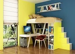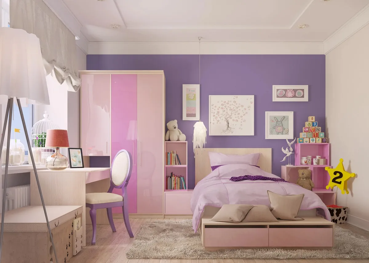 Детская комната в составе шкаф, тумба, рабочее место, полка, подходит для помещения площадью 16 квадратных метров. В дизайне мебели преобладает Фиолетовый нежный U400 ST9, использованы безопасные плитные материалы класса Е1 ЛДСП 16мм в кромке 2мм по видимой части, столешницы 32мм, применена фурнитура Hettich, система дверей купе.