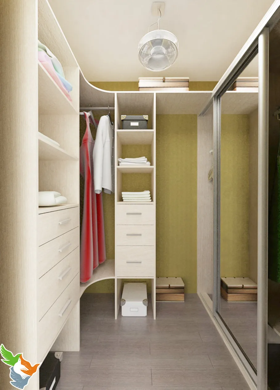 Вместительная гардеробная Сиеста включает несколько больших платяных отделов со штангами, ящики для белья и стационарные полки для немнущейся одежды.