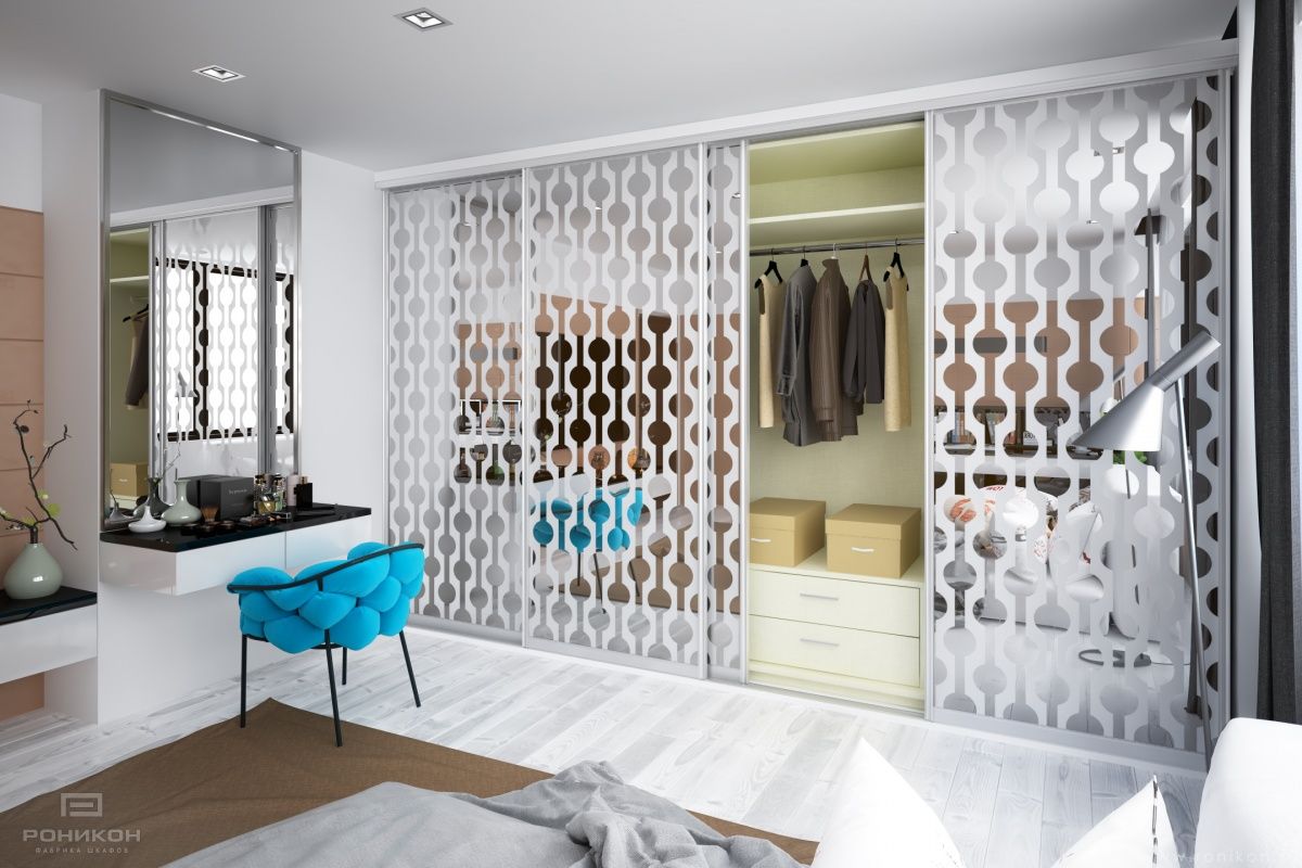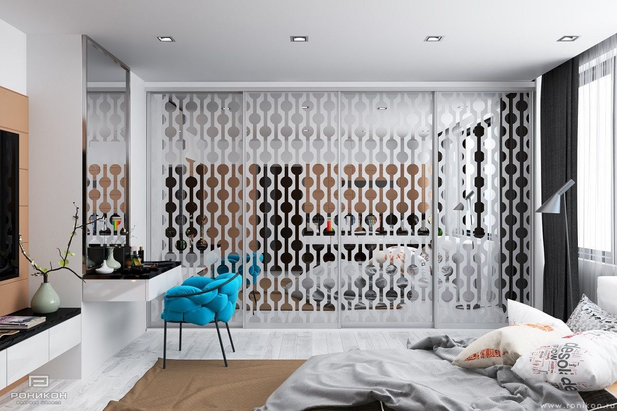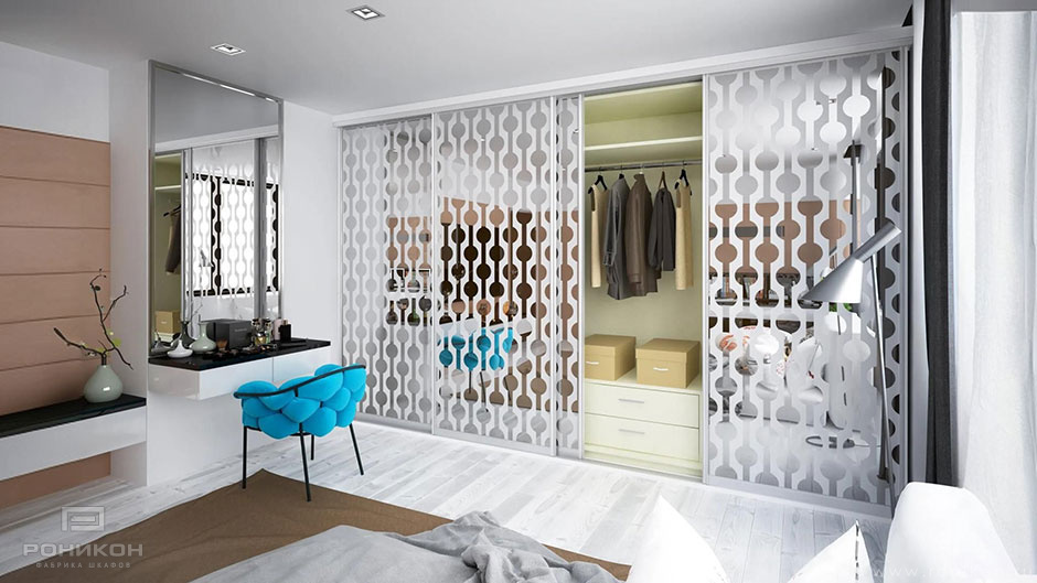 Индивидуальный проект организации гардеробной на базе широкоформатных зеркальных дверей-купе дополнен консольной тумбой и трюмо с зеркалом. В дизайне мебели преобладает Зеркало серебро в пескоструе, использованы безопасные плитные материалы класса Е1 ЛДСП 16мм в кромке 2мм по видимой части, применена фурнитура Hettich, алюминиевая нижнеопорная система.