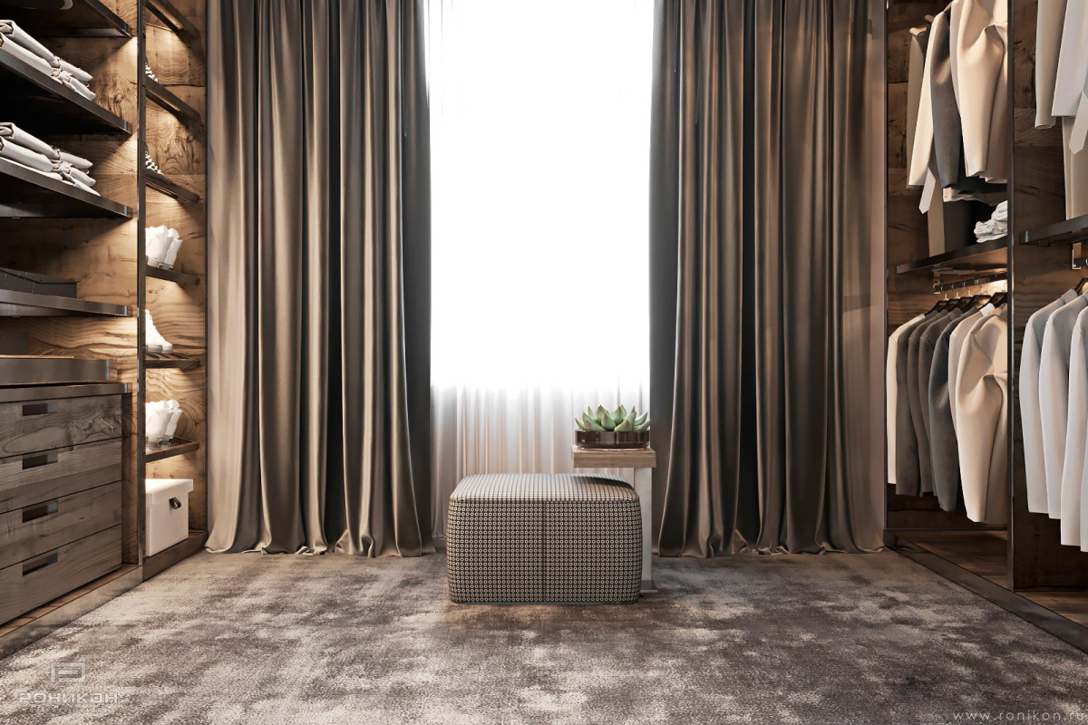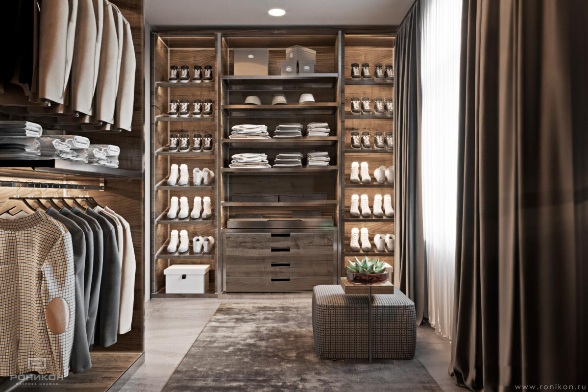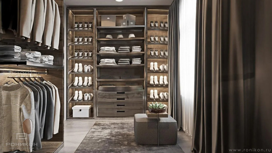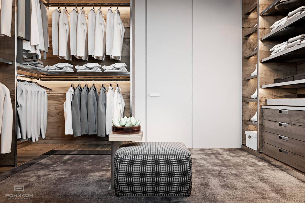 Гардеробная в виде открытых шкафов с полками, ящиками и штангами для гардеробной комнаты из ЛДСП Egger H3158 Дуб Виченца серый в структуре ST19 Deepskin Excellent. Стойки и столешницы толщиной 32 мм в кромке 2 мм по видимой части, направляющие Blum 100% выдвижения.