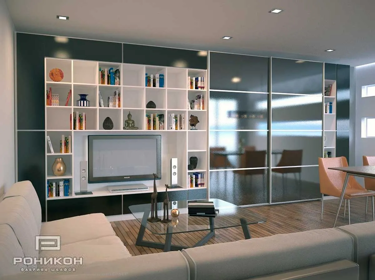 Встроенная стенка со шкафом-купе во всю стену подходит для помещения площадью 19 квадратных метров. В дизайне мебели преобладает Egger Белый премиум W1000 ST 76, Чёрный высокий глянец, использованы безопасные плитные материалы класса Е1 ЛДСП 16мм в кромке 2мм по видимой части, применена фурнитура Hettich, нижнеопорная система купе.