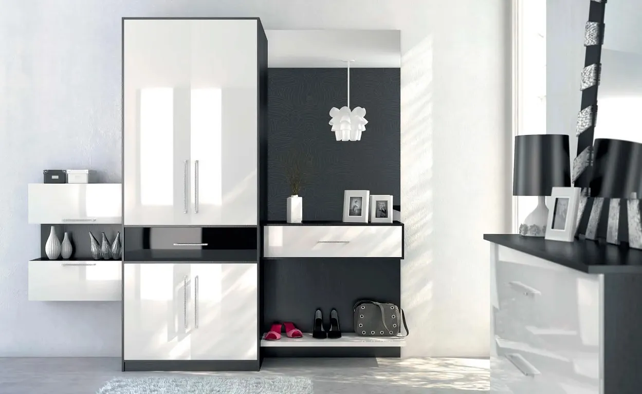 Прихожая на заказ в составе шкаф, полки, тумба подходит для помещения площадью 16 квадратных метров. В дизайне мебели преобладает МДФ белый, использованы безопасные плитные материалы класса Е1 ЛДСП 16мм в кромке 2мм по видимой части, применена фурнитура петли Boyard с доводчиком.