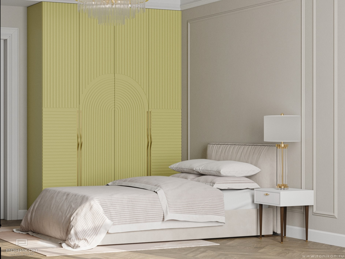 Фасады: Изготовлены из МДФ с фрезеровкой "лапша" и покрыты эмалью RAL 6021 Бледно зеленый. Это придает шкафу изысканный и утонченный вид.